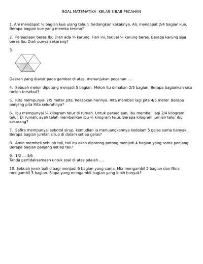 Soal Matematika Kelas 3 Tentang Pecahan - Contoh Soal Cerita Matematika Kelas 3 Sd Materi Pecahan Kumpulan Soal - Sisi buruk yan lain, saat mereka duduk di kelas 6 pasti akan mengalami kesulitan jika menemukan soal pecahan apa lagi yang berhubungan dengan soal cerita.. Soal penilaian harian ii matematika kelas 3. Sebuah benda yang dibagi dengan. Kalian tentu sudah pernah belajar pecahan dikleas 2 yaitu 1/2, 1/3 dan 1/4. Karena dengan di adakanya latihan soal ulangan matematika kelas 3 sd/mi kurikulum 2013 tersebut bermanfaat untuk mengasah keterampilan peserta . Ulangan harian 1 matematika materi pokok pecahan kelas 3 semester 2 tahun pelajaran 20./.