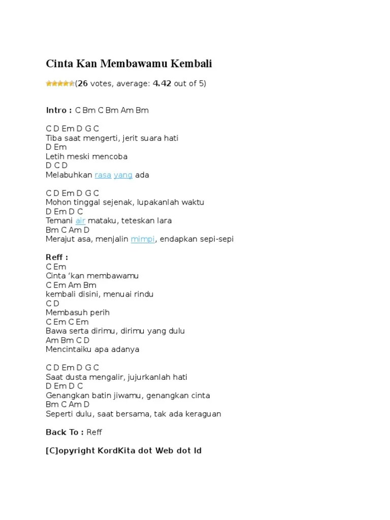 Intro f am f am dm am f g am tiba saat mengerti, g c f jerit suara hati. Lyrics to cinta kan membawamu kembali by dewa 19. Chord dewa 19 cinta kan membawamu kembali. Dewa 19 di grand final indonesian idol x (adrian putra/fimela.com). Indonesiachord.com is focused on providing song's lyrics and chords as an appreciation to . G am letih meski mencoba. Lirik dan chord dewa 19 Lirik lagu cinta kan membawamu kembali dari dewa. Layanan mobile dari situs entertainment terbesar indonesia, kapanlagi.com. F em f am dm am f g am.tiba saat mengerti g c f jerit suara hati. Masukkan kata kunci lagu (judu lagu atau nama artis) .